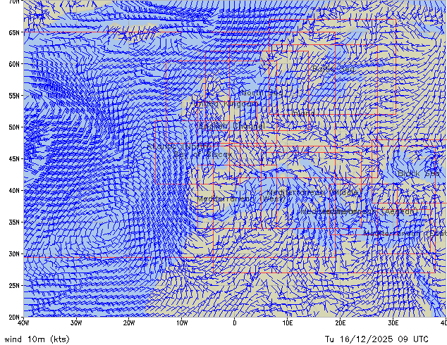 Tu, 16 Dec, 09:00 GMT Wind Barb Scale and Beaufort Scale with wind speed (knots, m/s, km/hr, miles/hr) and Descriptions
